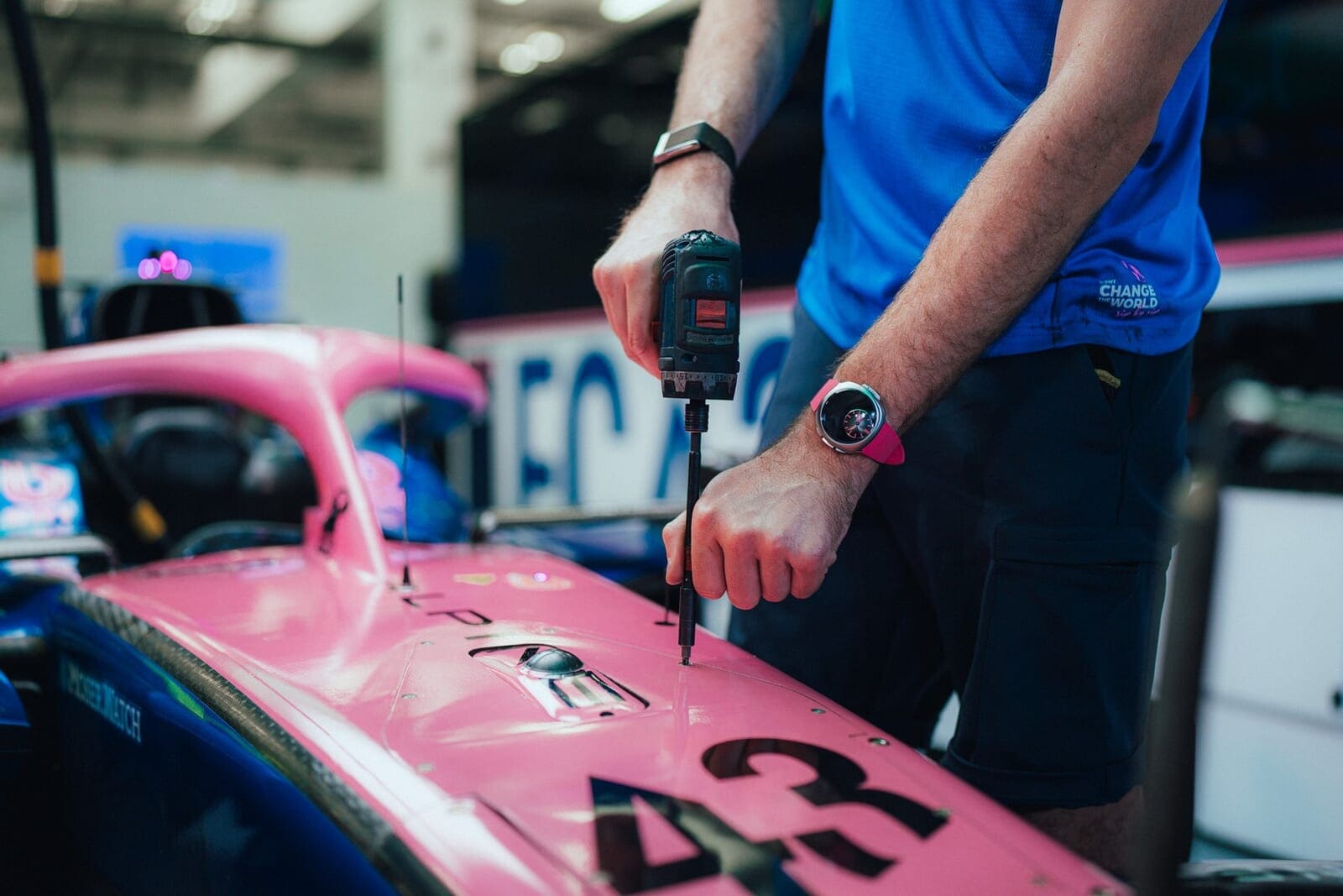 そしてもう1本は、舞台裏でチームを支えるメンバーのために開発された「ストリームライナー・アルピーヌ メカニック ピンクエディション」。こちらはケース径42.6mmのステンレススチールにピンクのコンポジットを組み合わせたコンビネーションケースを採用。12時位置に配されたH.モーザーならではの美しいグレーフュメダイアルの下に、デジタル表示を融合させたコネクテッドムーブメントを搭載する50本限定モデルだ。今後のレース日程やカウントダウンなど、ピットレーンでの過酷な状況下でも瞬時に情報を把握し、コミュニケーションを迅速化する真のプロフェッショナルツールに仕上がっている。こちらにも、ドライバーズモデルと同じくピンクのラバーストラップがセットされる。