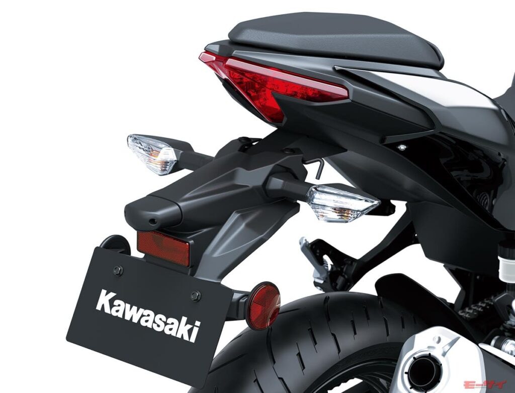 ニンジャZX-6Rと同様のコンパクトなプロジェクター/リフレクターハイブリッドタイプのヘッドライトは内部全体をブラックにすることでヘッドライトの非点灯部を暗く見せ、ニンジャシリーズらしい精かんな表情を作り出している。またアッパーカウルは新しい2灯ヘッドライトを包み込むようにデザインされ、力強いスタイルを創出。ヘッドライトの下にはアグレッシブさを強調するスポイラーも装備する。フロントウインカーはビルトイン式だ。