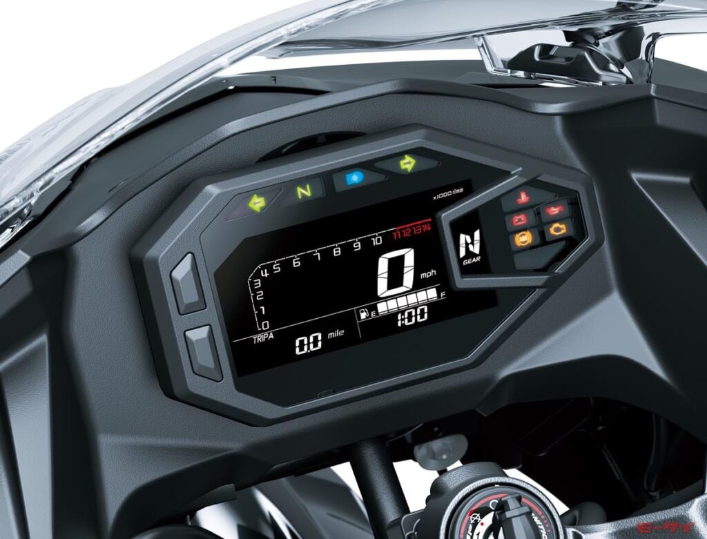 ・オドメーター、バースタイルタコメーター、ギヤポジションインジケーター、燃料計、デュアルトリップメーター、航続可能距離、瞬間/平均燃費、⽔温、時計、デバイス通知(スマートフォン接続機能・メール・電話)、サービスインジケーター、エコノミカルライディングインジケーター