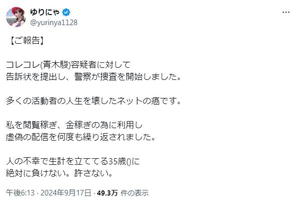 ゆりにゃはXで「コレコレ(青木駿)容疑者に対して告訴状を提出し、警察が捜査を開始しました」と報告すると、