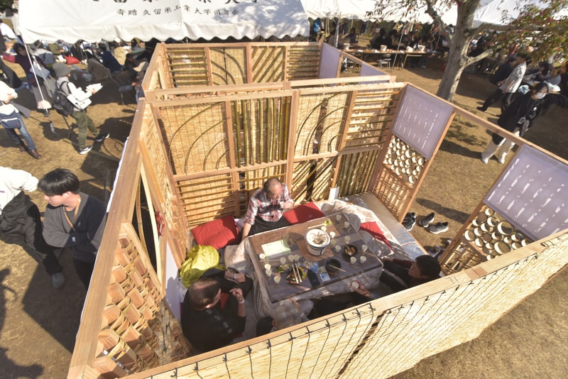 昨年から事前予約できる有料の休憩スペースを設け、仮設テントにテーブルやいす、食事を温める七輪を設置した。今年はこたつを置いた「お座敷」も設営。空間の仕切りには、放置竹林の竹を使って、学生が「和・伝統」を表現した。