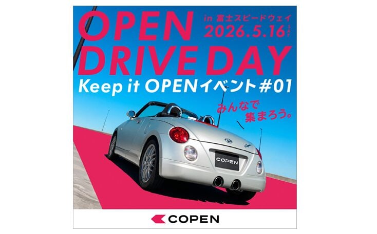 同イベントは、コペンオーナー同士の交流を目的とした参加型企画で、第1弾「OPEN DRIVE DAY」を2026年5月16日に富士スピードウェイで開催する。会場では200台限定のパレードランや同乗体験、ステージイベント、抽選会などを実施するほか、参加者一斉でのルーフ開閉やライト点灯といった企画も予定する。参加対象はコペンオーナーと同伴者1名までで、定員は1,000台、参加費は3,500円となる。