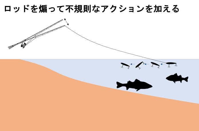 意図的にロッドを煽ってルアーのバランスを崩し不規則なアクションを加えます。これがパニックに陥ったベイトを演出でき、ターゲットに猛烈アピールします。