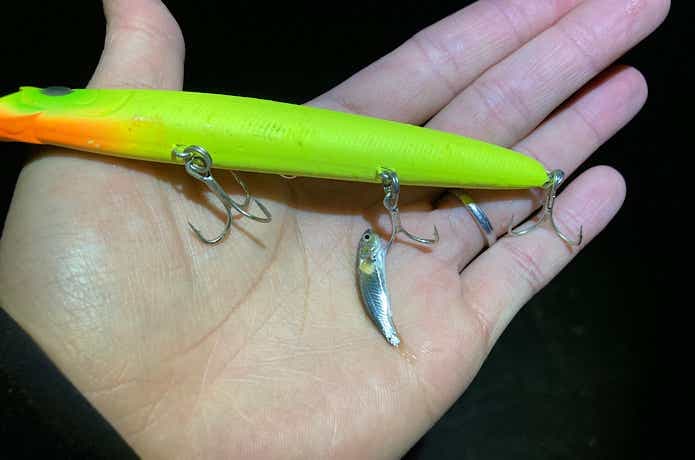 どうしても空気抵抗が増えて飛距離は落ちてしまいますが、パニックアクションでも反応しない魚に口を使わせる最終手段としてお試しください。