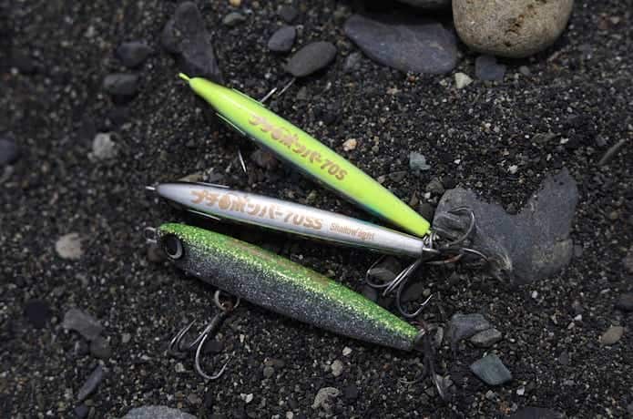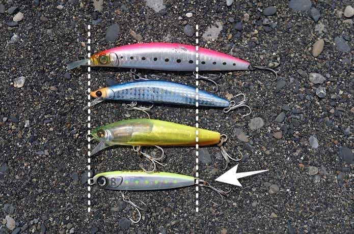 筆者の場合、水面直下をじっくり攻めたいときは、浮き上がりやすくレンジキープがしやすいSS(スローシンキング)を使用。風が強い日や海面が荒れている状況では、SSだと水面を滑ってしまうこともあるため、沈下速度が少し速く操作感の安定したS(シンキング)タイプを使用しています。