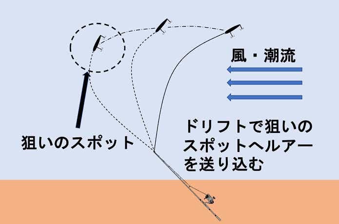 ドリフトとは、潮の流れや風によるライン抵抗を利用して、ターゲットが口を使いやすいスポットへルアーを送り込むテクニックです。