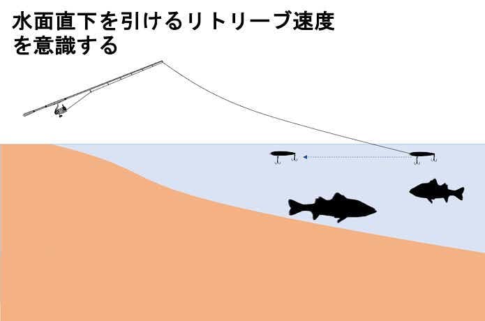 ただ巻きのポイントは、水面直下を引いてこれるリトリーブ速度を意識すること。