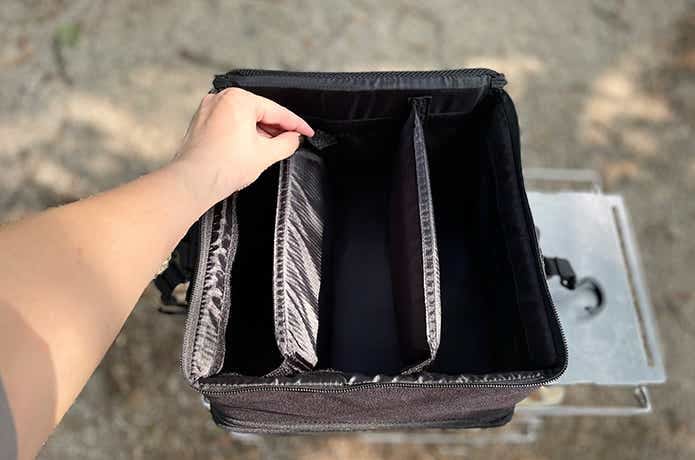 ベルクロ式で脱着できるうえ、メス面のベルクロテープが端から端まで横断しているので、仕切りたい幅を自在に調節できるのが便利です。