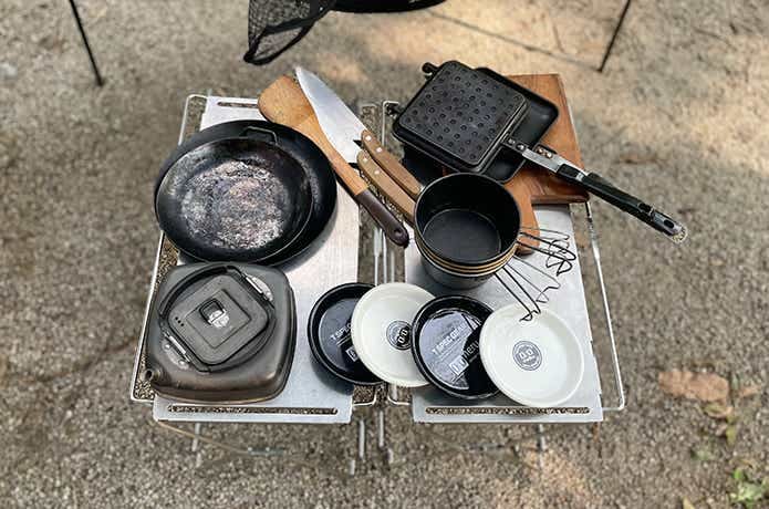 TAKIBISM「フライパンディッシュ」の小と中、木ベラに包丁2本、ウッドプレートにホットサンドメーカー、シェラカップが4個、「kozara」が4枚、RidgeMonkeyの「スクエアケトル 0.5L」。