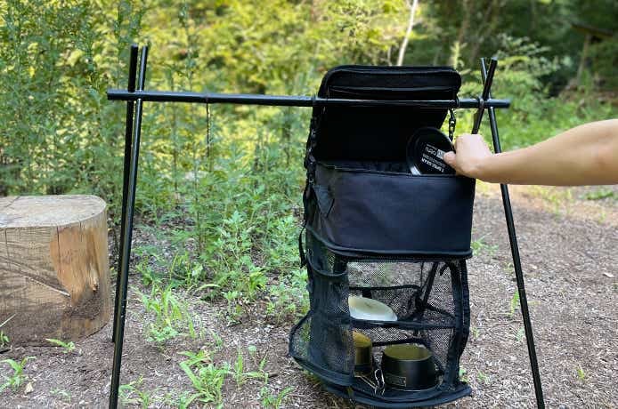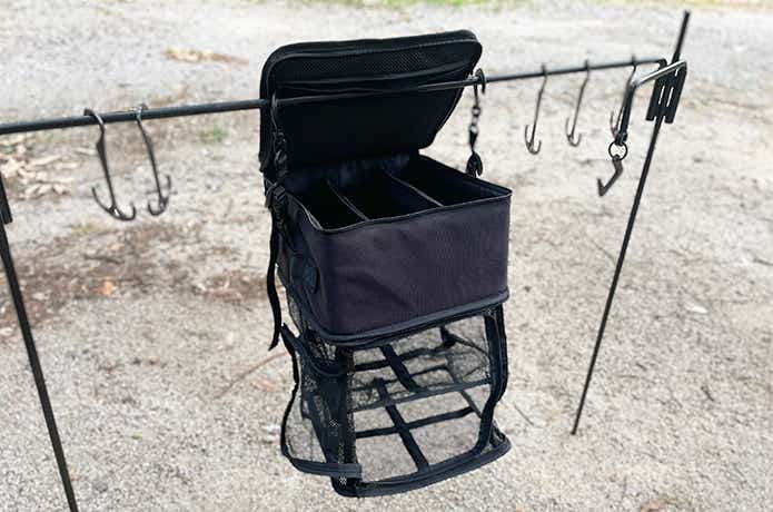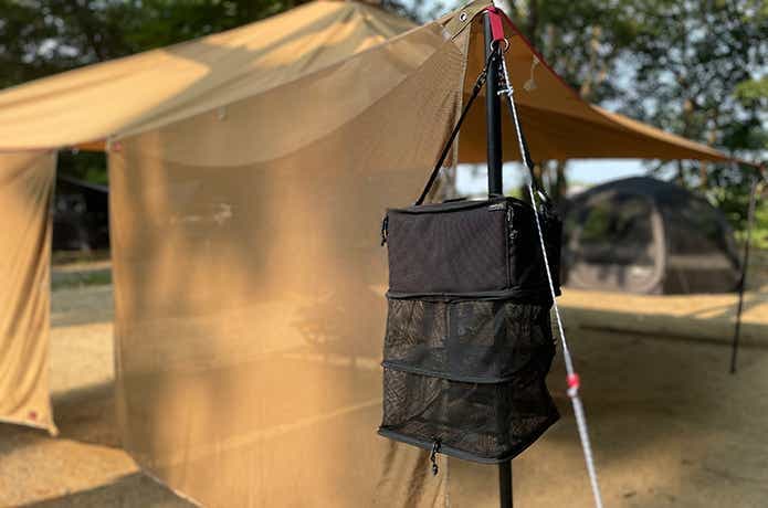 たっぷり収納できるソフトコンテナに、2段のドライネットが合体した「コンテナ+ドライ」。ソロキャンプならこれ1つで運搬→乾燥→収納の動線が完結します。