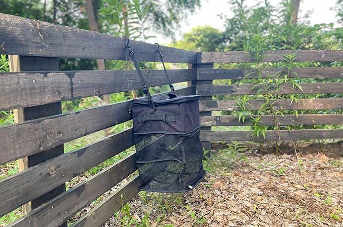 けれど、インディアンハンガーなど地面との距離が近い場所に吊るす場合、蓋が開く位置まで下げると今度はドライネットが地面につっかえてしまいます。
