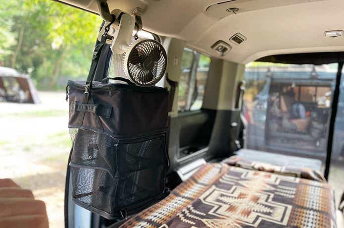 そこで画像のように、「コンテナ+ドライ」を車内に吊るせば、小物収納に最適な簡易ラックとして使えます。合計3段もあるので、洗面ツールなども入れておけますね。