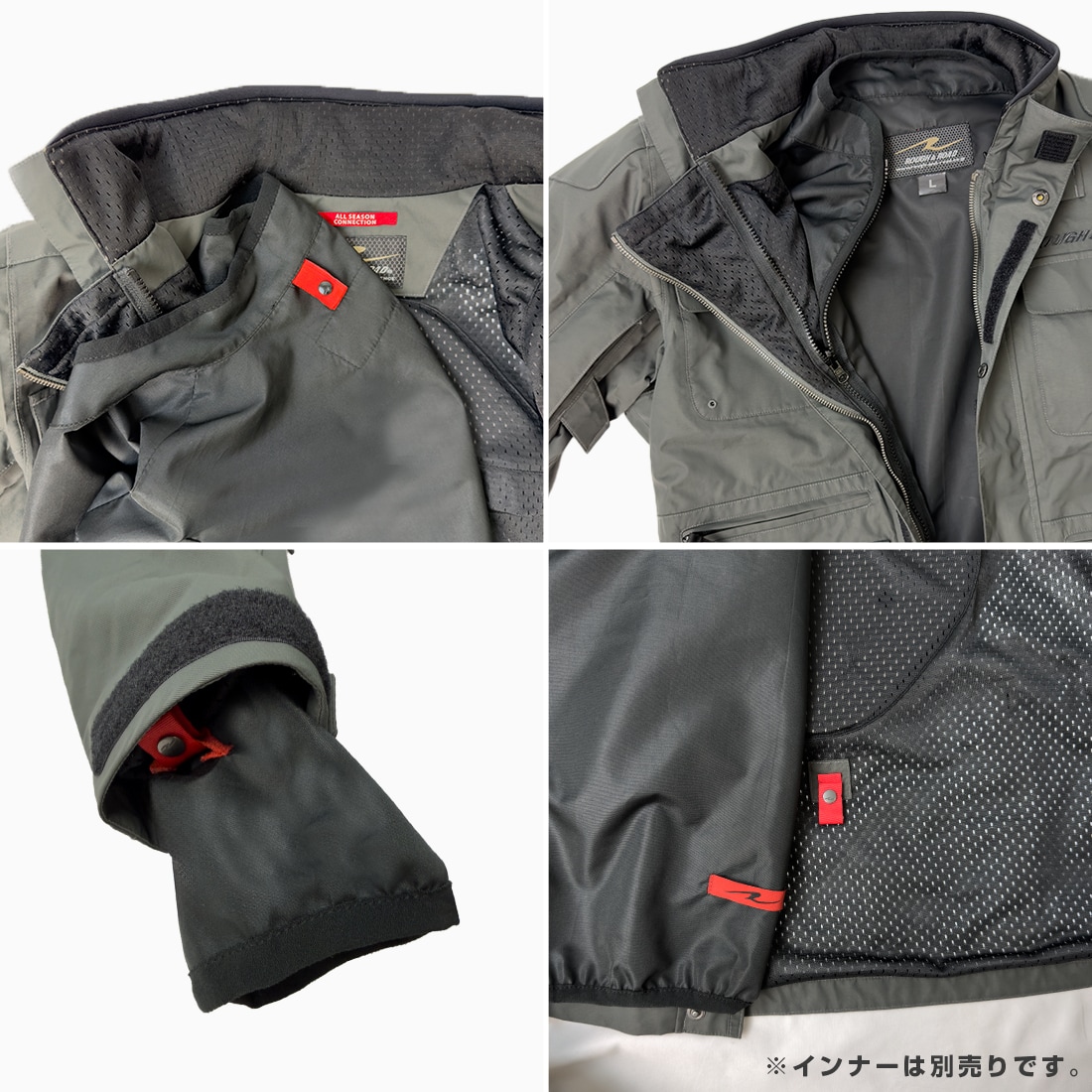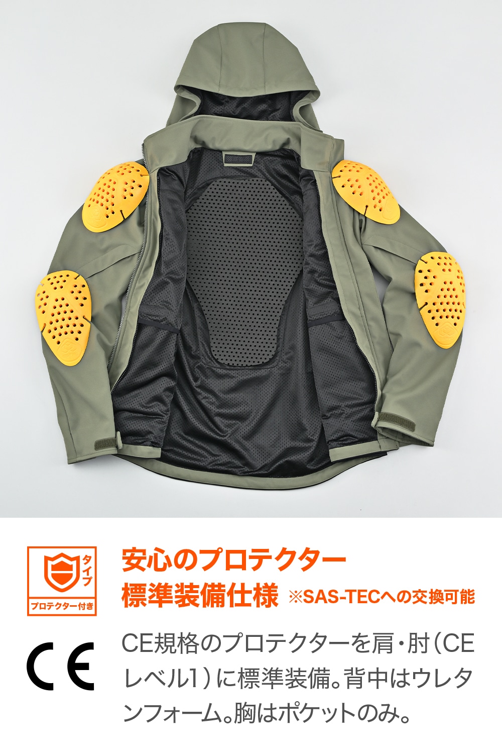 肩・ヒジにはCEレベル1、背中にはウレタンフォームプロテクターを標準装備して安全性も十分だ。別売のサーマフレックスインナージャケットと連結すれば冬でも暖かく使えるオールラウンダーだ。