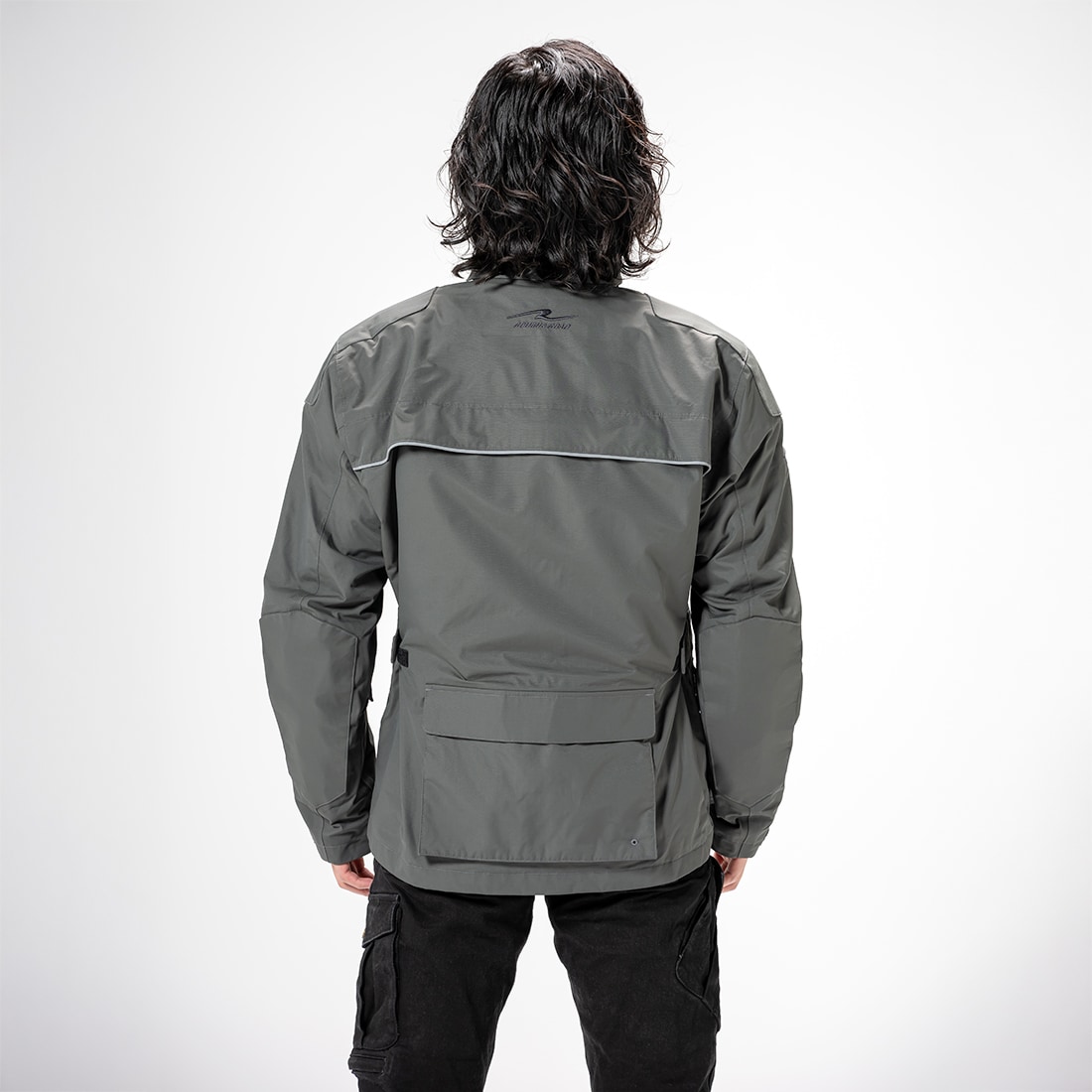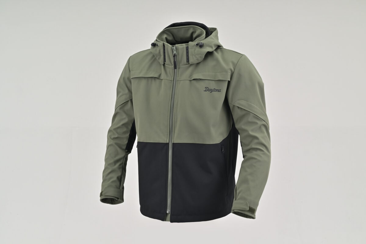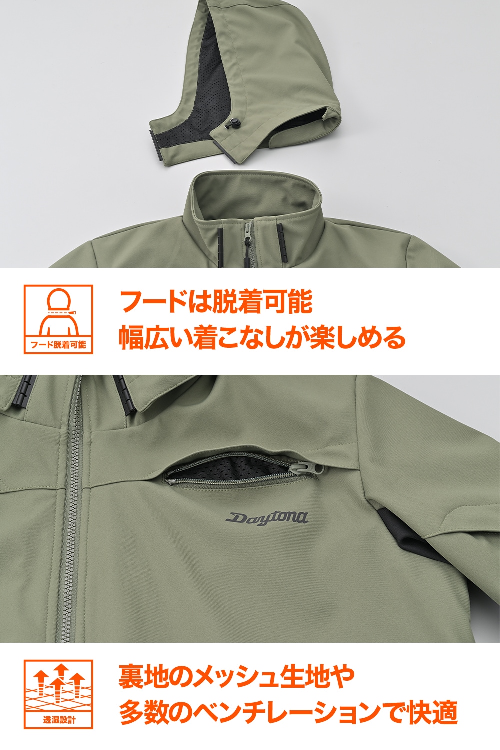 フロントファスナーはサイズ調整と大型エアインテークを兼ねる二重構造で、春夏の温度変化に柔軟に対応する。肩・ヒジ・背中には脱着式ソフトパッドを標準装備し、日常使いからツーリングまで幅広く活躍。「簡易防水」を謳っているが、耐水圧30,000mm・透湿15,000g/㎡/24hの高性能素材を採用し、突然の雨にも安心だ。