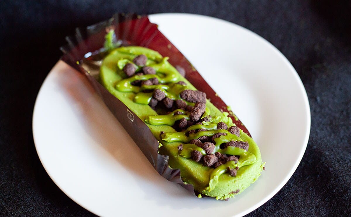 横に長く、角は丸くカットされていますね。同じ緑なので少しわかりにくいけれど、抹茶ソースの姿も確認できます。