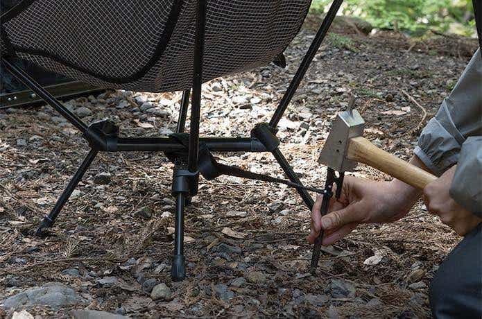 脚先端にはスリップ防止グリップを装備。さらにチェアアンカーとしてペグダウンできるタイベルトも備え、風対策にも対応しています。
