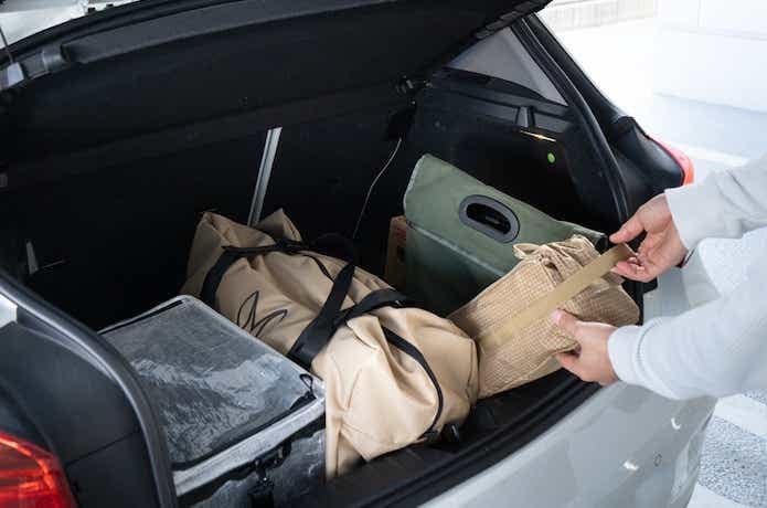 ちょっとした隙間に差し込めるため、コンパクトカーでも無理なく積載でき、キャンプツーリングにも対応。収納スペースに悩みにくいサイズ感です。