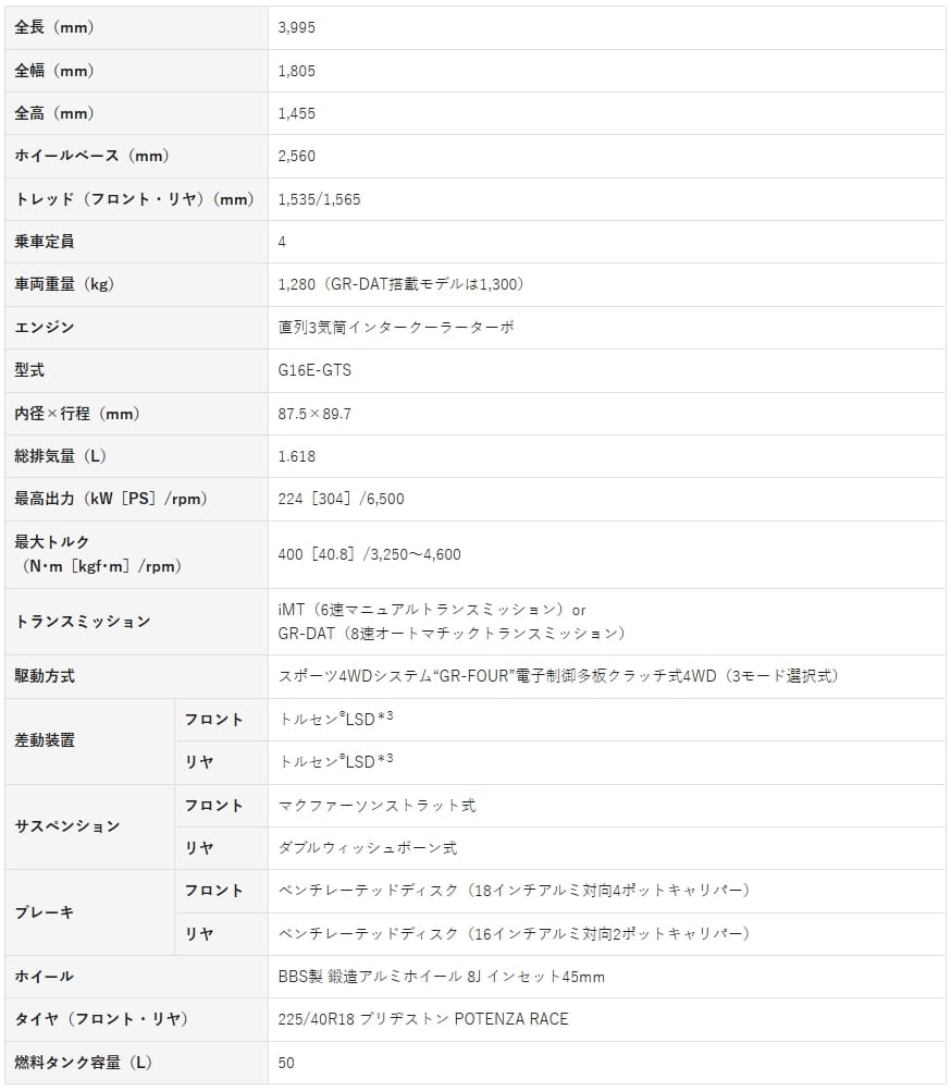 同モデルは、モータースポーツ参戦で得た知見を反映した改良を実施した。新開発のGRステアリングを初採用し、操舵性や操作性を向上させたほか、電動パワーステアリングの制御を見直し高負荷時のステアリング操作を改善。また一部グレードでは新開発のハイパフォーマンスタイヤ「ブリヂストン POTENZA RACE」を採用し、限界域でのコントロール性を高めた。価格は396万7200円から588万2200円となる。