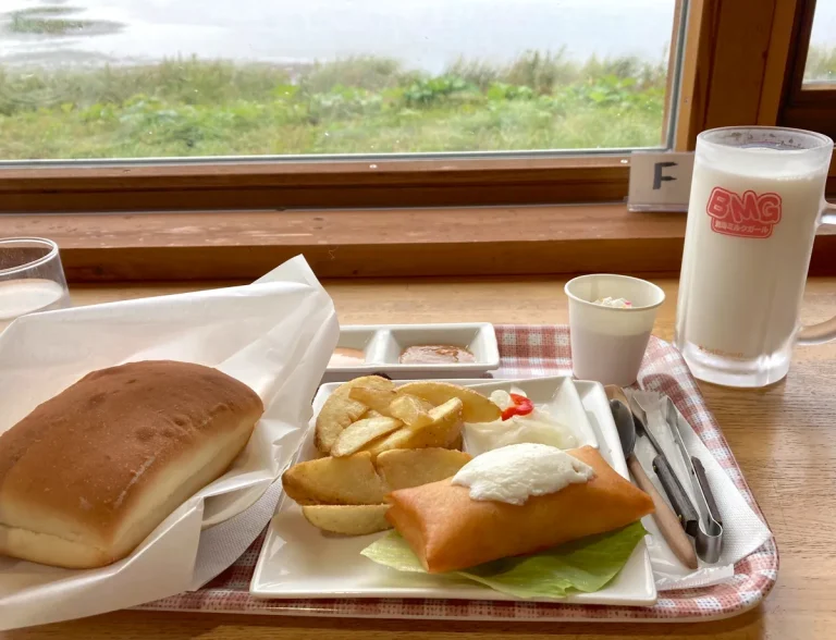 海を挟んで反対側に野付半島が見える小さな道の駅で、野付半島を有する酪農で有名な「別海町」の牛乳を使ったソフトクリーム、それから野付半島の大きなホタテを使った「ホタテフライ丼」などを味わうことができます!