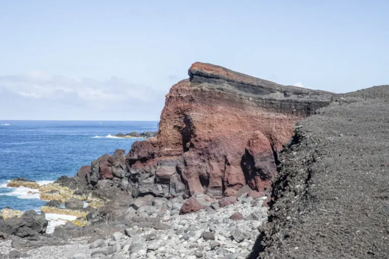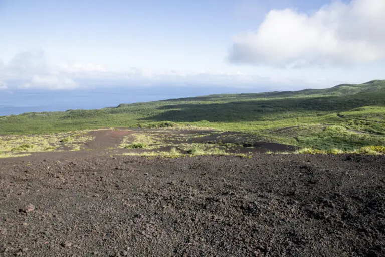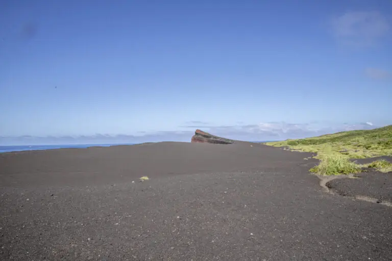 これが「新鼻新山」。三宅島の中では一番インパクトのあるジオスポットと言って良いでしょう。「山」と名前がついているのですが、普通の山とはちょっと違います。そうです、ここの地面は全て火山からの噴出物なんです。青い空と青い海がなければ、まるで月や火星とも見違えるようなこの光景は、紛れもなく東京都内のものなんですよ。