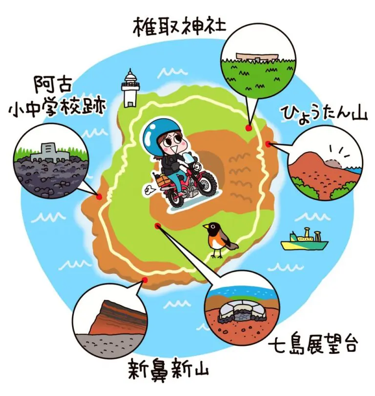 今回紹介する三宅島はイラストで表すとこんな感じ。バイクだと一周約1時間で回れてしまう小さな島で、ダイビングやサーフィンといったマリンスポーツをしに訪れる人も多いです。また、他の伊豆七島と同じく釣りのメッカとしても知られており、土日などはバイクを積むためのコンテナがクーラーボックスで満載になっちゃうらしいですよ。