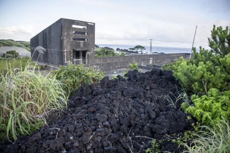 はい、ここは「阿古小中学校跡」です。錆ヶ浜港から北にほんの5分程度で到着します。名前の通り、ここはかつて三宅島西部に位置する阿古地区の子供たちが通う小中学校でした。しかし、1983年の噴火の際に阿古集落を襲った溶岩流が、三階建ての校舎の二階までを埋め尽くしてしまい、こんな姿に。
