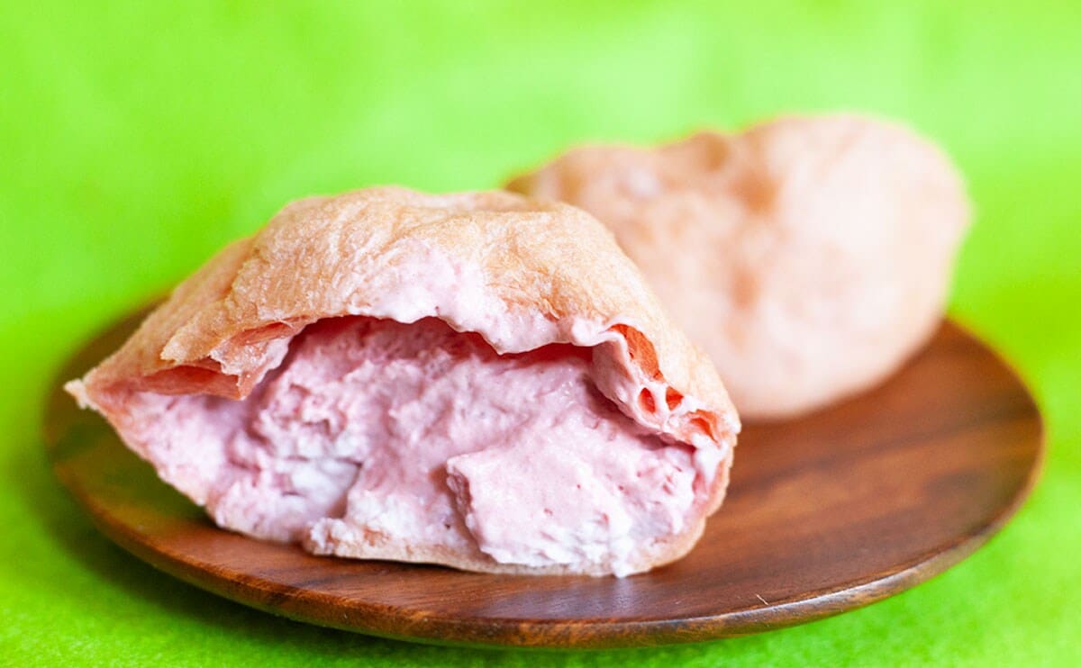 簡単に言えば、この商品は、2つの味わいを楽しめるシュークリーム。ピンク色の生地の中に、ほんのり塩味の効いたさくらクリームと、果肉入りいちごクリームが詰まっているのだとか。