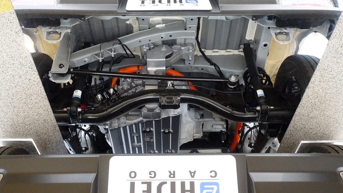 バッテリーはLFPで床下に36.6kWhの容量を搭載しているので、全体に重量増となっているが、EV特有の、ひと転がりから最大トルクを発揮できる特性のため、車両重量の重さを感じる場面は少ない。エンジニアによればe-ハイゼットカーゴも350kgのフル積載で35%の勾配を走行できる性能を持たせたというように、パワフルな軽自動車なのだ。