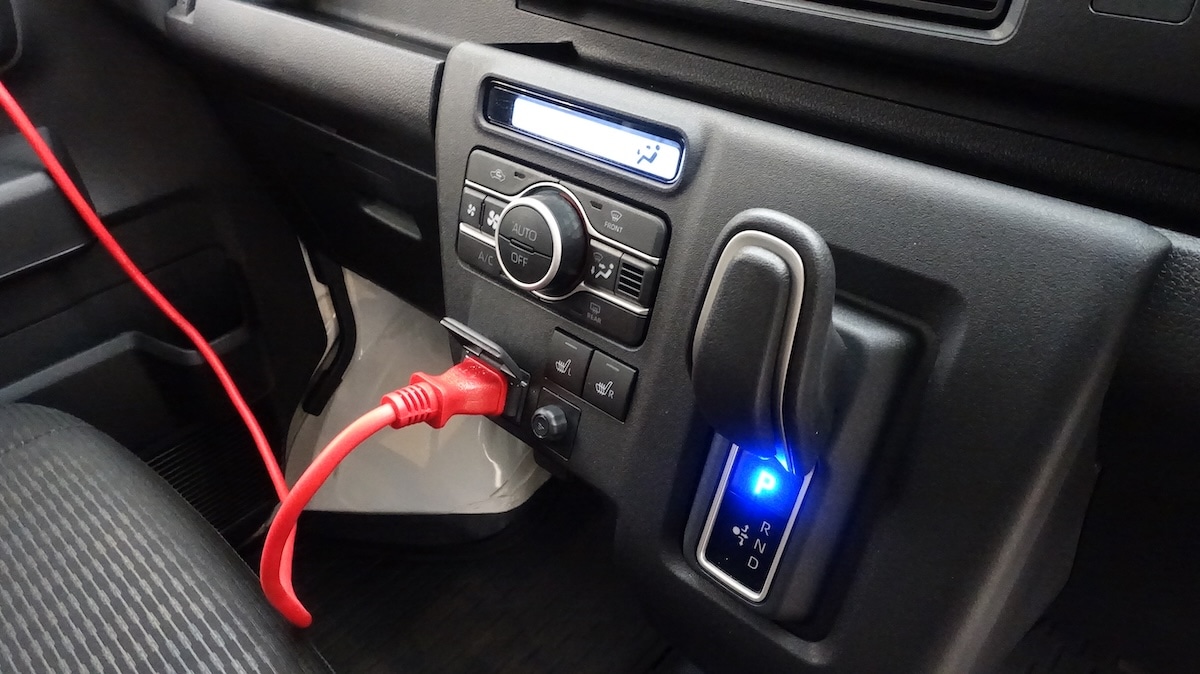 便利機能で注目なのは100Vのアウトレットだ。インパネに100Vのコンセントがあり、すぐに車両の電源が利用できるのは使い勝手が良い。電動工具やファン付き作業着の充電やPC、スマホといった充電にも使えるため、働くクルマに欠かせない100Vコンセントを装備というわけ。