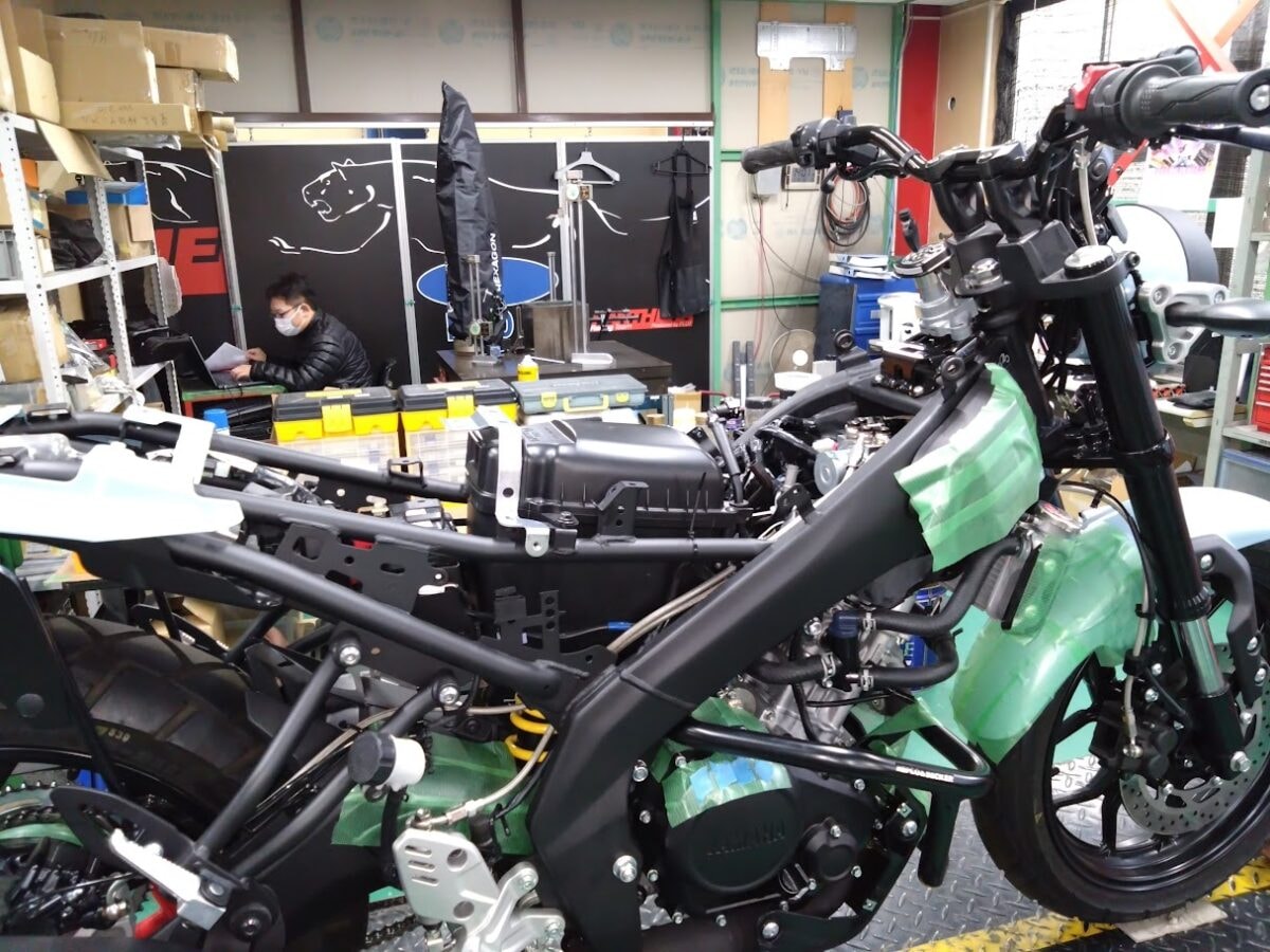 何やらXSR125の開発作業をしておりました。バイクの向こうにいるのは若手のクリ。クリは仕事してる風……(笑)