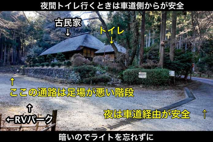 RVパーク駐車区画からトイレまでのルートに少し階段があり、そこはやや足場が悪くなっています。夜にトイレに行くときは、車道側からアクセスし、スマホやLEDライトで足元を照らしながら行くのが安全です。