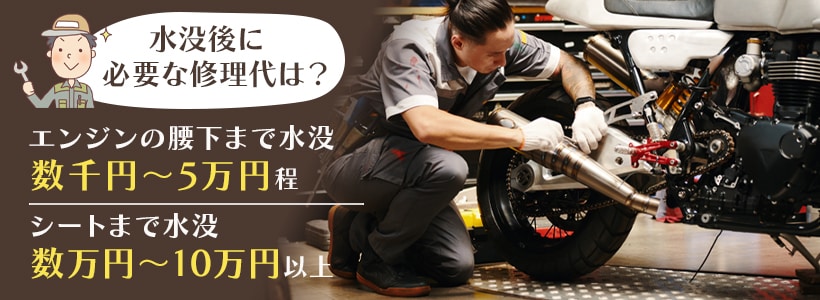 バイクがエンジンの腰下まで水没した場合、運が良ければ修理代は3千~8千円程度で済みます。ただし、これは冠水した道路を通過するなど、水没が一瞬で済んだ場合です。水没した時間が長くなると、ブレーキ関係やホイールベアリングなど、さまざまな部品への影響が大きくなります。修理代は詳しい状況や交換パーツによっても変わりますが、修理業者に依頼した場合は2万~5万円程度の予算で考えておくとよいでしょう。 シートまで水没した場合は、エンジンやバッテリー周り、マフラー、駆動系、ブレーキ、各種電装系など、多くの部品の点検・交換が必要になります。加えて、エンジンの腰下まで水没した場合と同等の清掃・点検や注油・グリスアップなども必要です。修理代は水没時間や水没後の時間経過、交換パーツによって変動しますが、安ければ2万円前後、最悪の場合は10万円前後になるケースもあります。浸水によってエンジン内が錆び始めている場合は特に高額になりやすく、修理するよりも新たにバイクを買ったほうが安くなるケースも少なくありません。