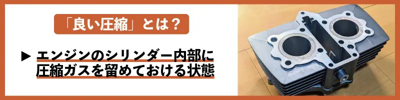 「良い圧縮」とはピストンによる圧縮を十分におこなえる状態で、エンジンのシリンダー内部に圧縮ガスをしっかり留めておける状態です。