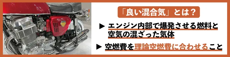 「良い混合気」とはエンジン内部で爆発させる燃料と空気の混ざった気体(ガス)のことで、特に燃料と空気の割合である空燃費を理論空燃費に合わせることを指します。