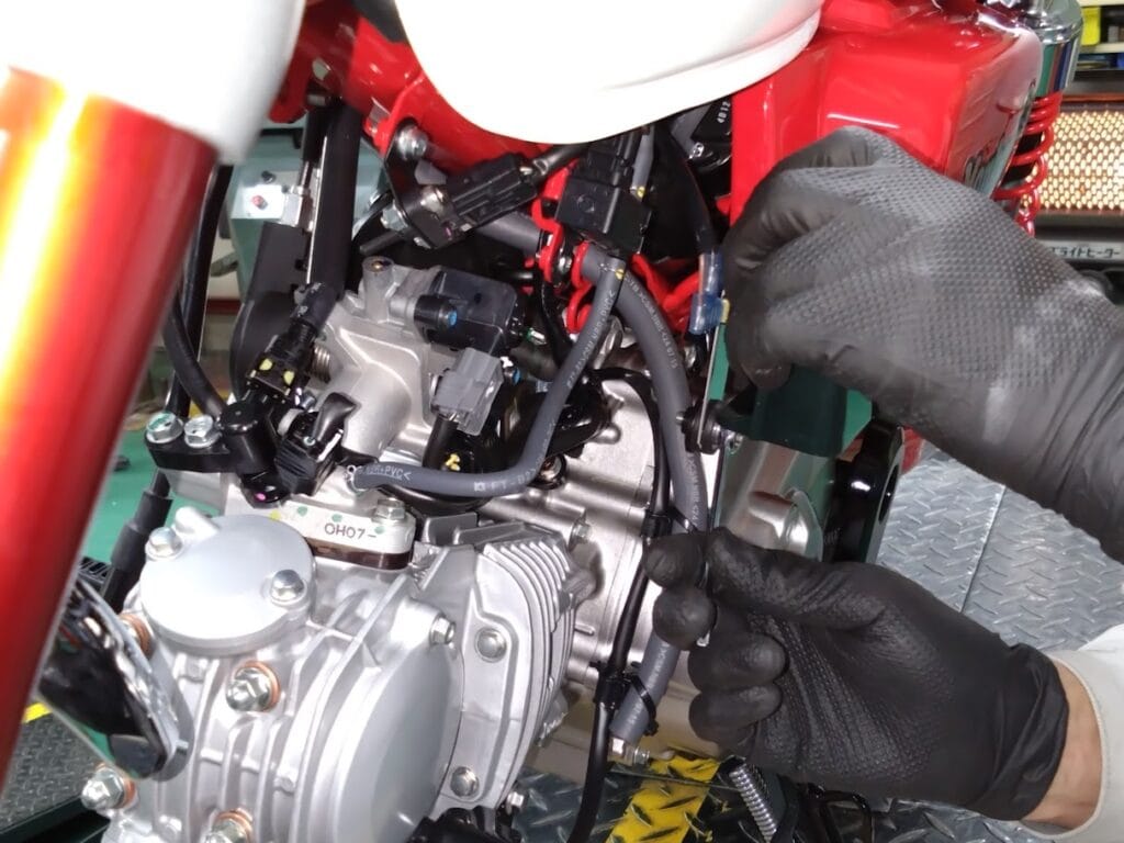 タンク下のフレームに沿ってハーネスを車体左側へ取り回します。(もちろんタンクを外したほうが楽チン)