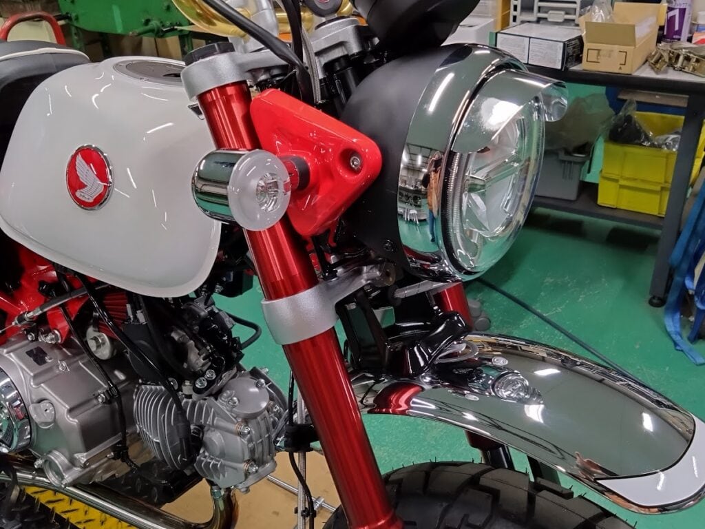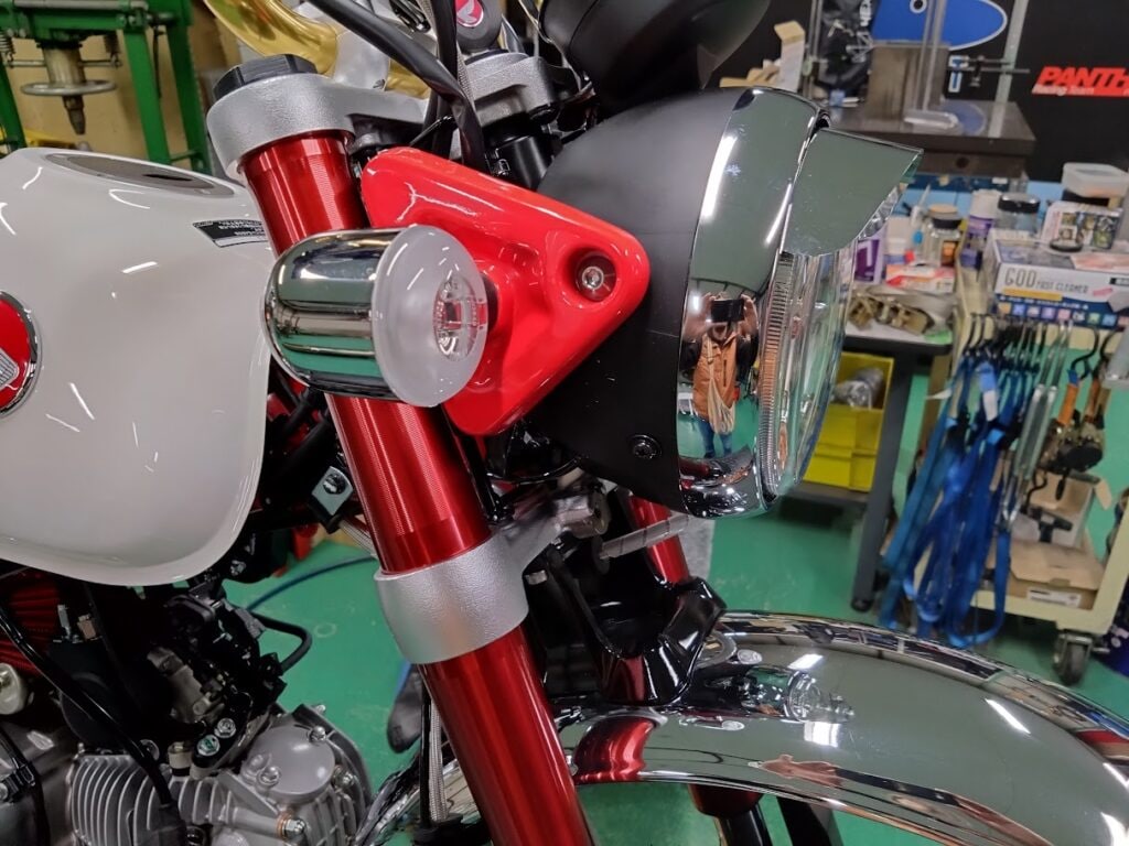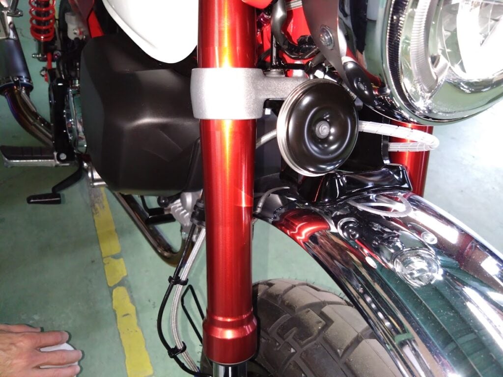 ウチのモンキーは弊社オリジナル「SWAGE-LINE PRO」(試作)が装着されており、アンダーブラケット下部に、ホーンを移設するキタコさんのは同時装着が難しそう。