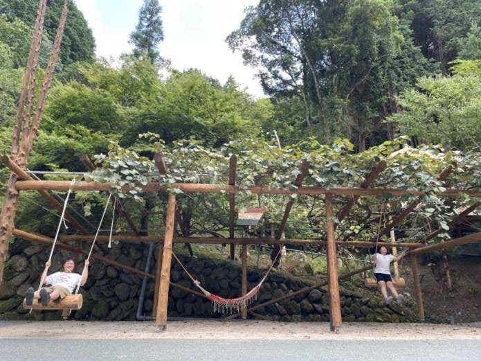 場内には地元の檜で作った優しい風合いのブランコやハンモック、水遊びができる太陽の池など、遊び場も充実しています。車で10分圏内に複数の温泉施設や野菜の直売所があり、犬鳴ダム湖畔では四季折々の風景が味わえます。