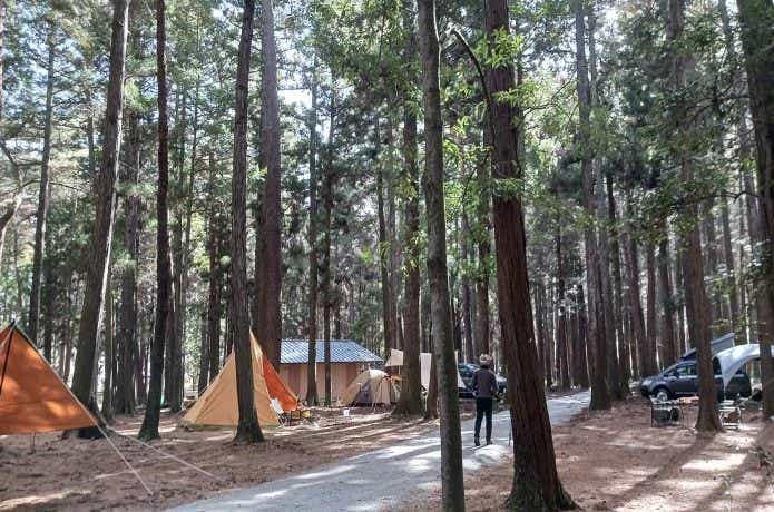 都心から1時間ほどとアクセスしやすい立地にありながら、場内は豊かな森に囲まれ、優しい木漏れ日が差し込み、ゆったりとした雰囲気に包まれています。110㎡を超える広々した区画サイトと、フリーサイトやログキャビンでのんびり過ごせますよ。