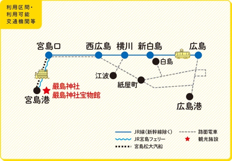 宮島を訪問する際は別途、廿日市市が課税する宮島訪問税(100円)が必要です。本商品に宮島訪問税は含まれていません。また、嚴島神社の拝観券は事前に、宮島桟橋から徒歩約5分の「TOTO宮島おもてなしトイレ内観光案内所」での引換が必要です。