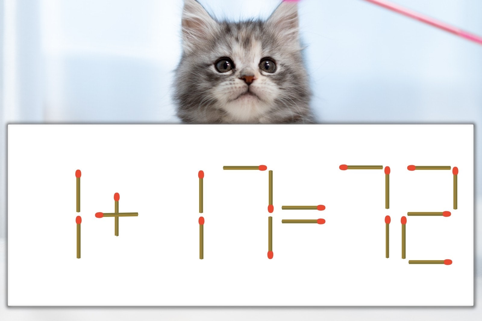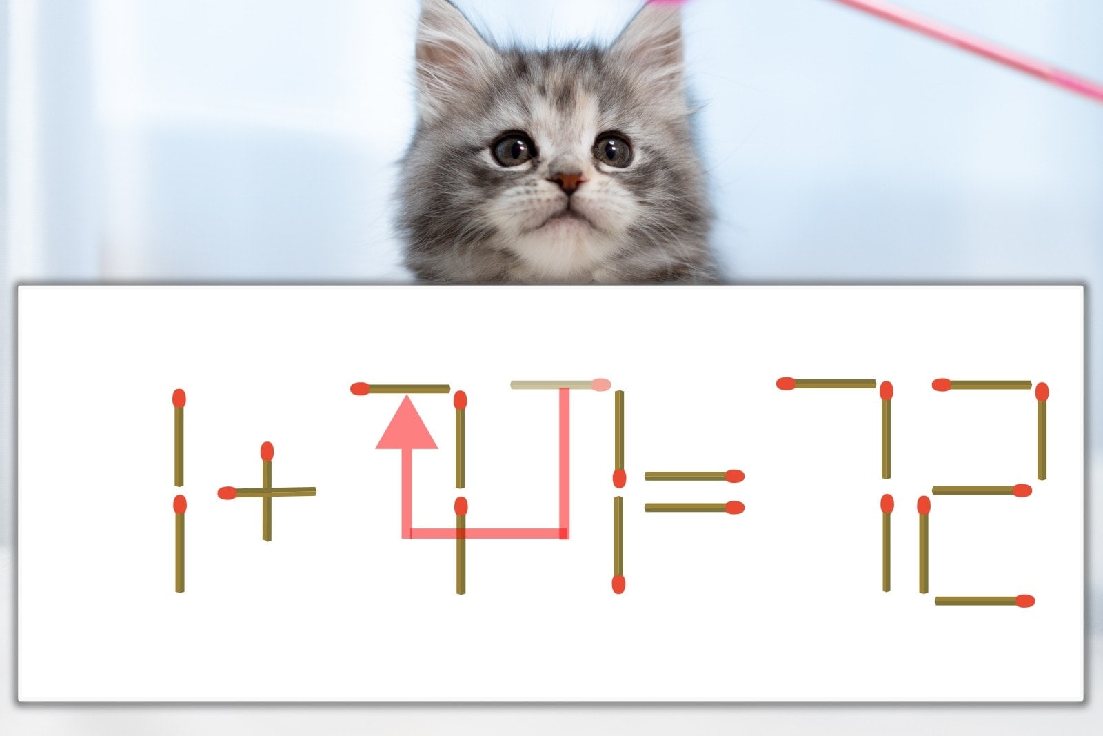 「7」を別の数字に変化させると答えが導き出せます。「7」のマッチ棒を1本移動して、「1」を「7」にしてみましょう。すると、「1+71=72」が成立します。