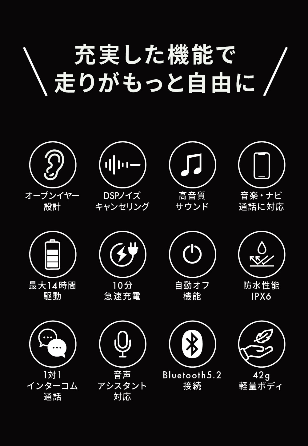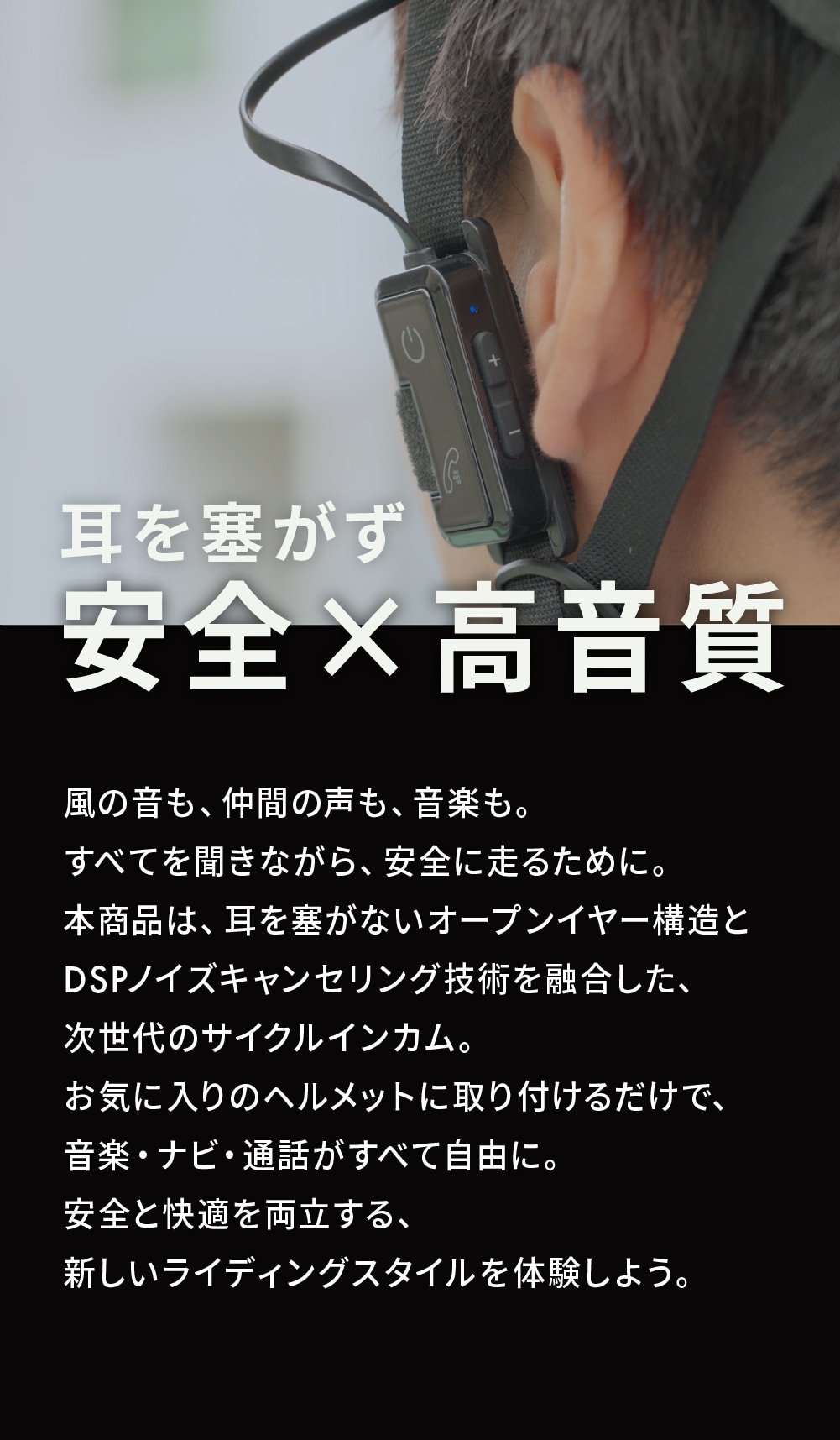 本商品は耳を塞がないオープンイヤー構造とDSPノイズキャンセリング技術を融合した次世代のサイクルインカムです。ヘルメットに取り付けるだけで、音楽・ナビ・通話がすべて自由に。安全と快適を両立する、新しいライディングスタイルを体験いただけます。