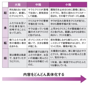 箱書きを進めながらストーリーの面白さを引き上げるためには、中箱の箱書きの際に、その展開でどのような演出をすればいいのか、ひとつのシーンに対して複数の演出候補をあげましょう。そのなかから大箱で書き出した全体のストーリーと合致した演出を選択します。