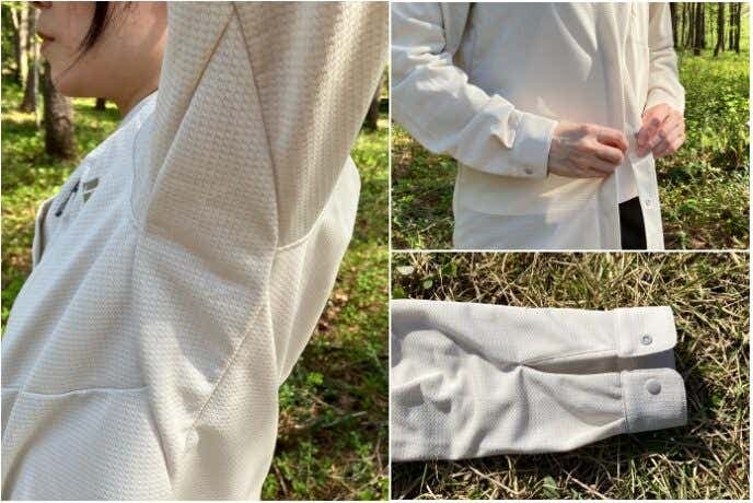 さらに、袖口は片手でも扱いやすいスナップボタン、かつスリット部分にはボタンがないので、腕まくりもらくらく。行動しながらでも体温調節がしやすく、登山での使いやすさが考え抜かれたつくりになっています。