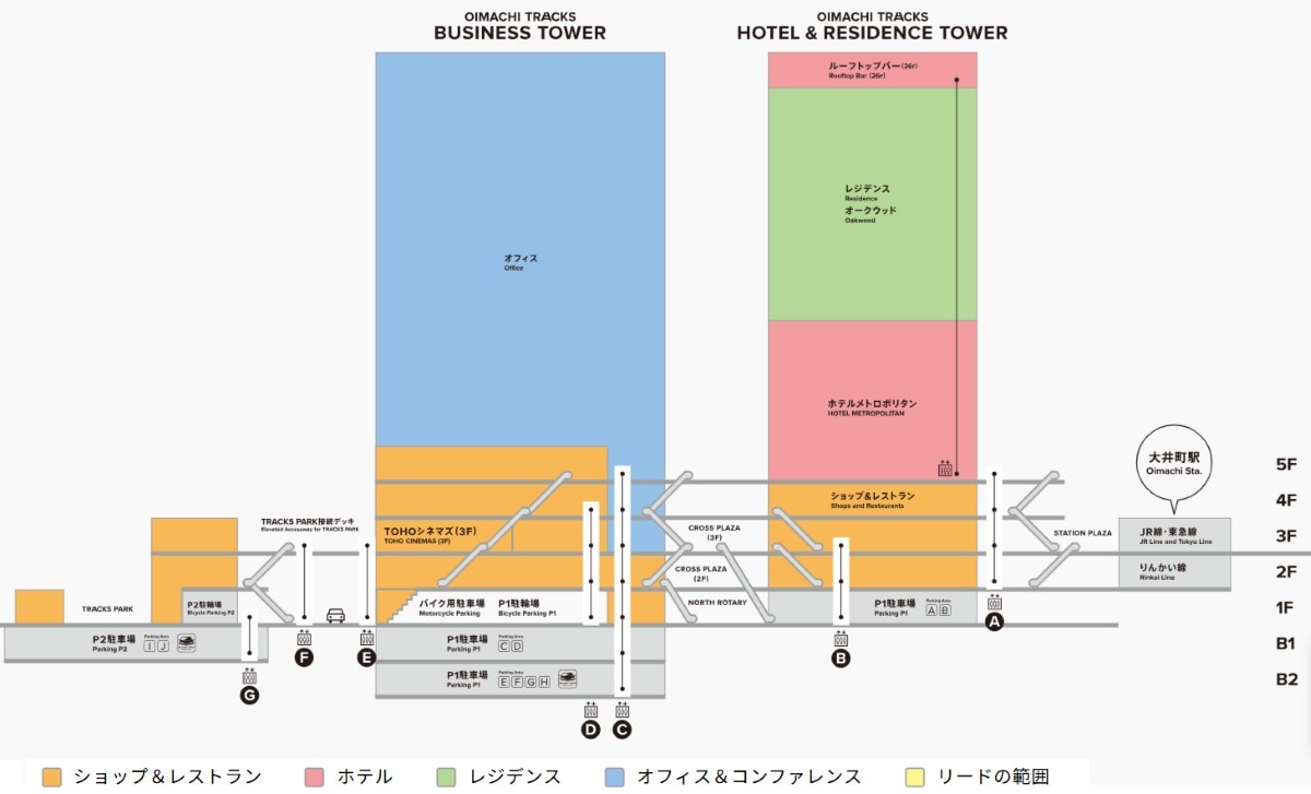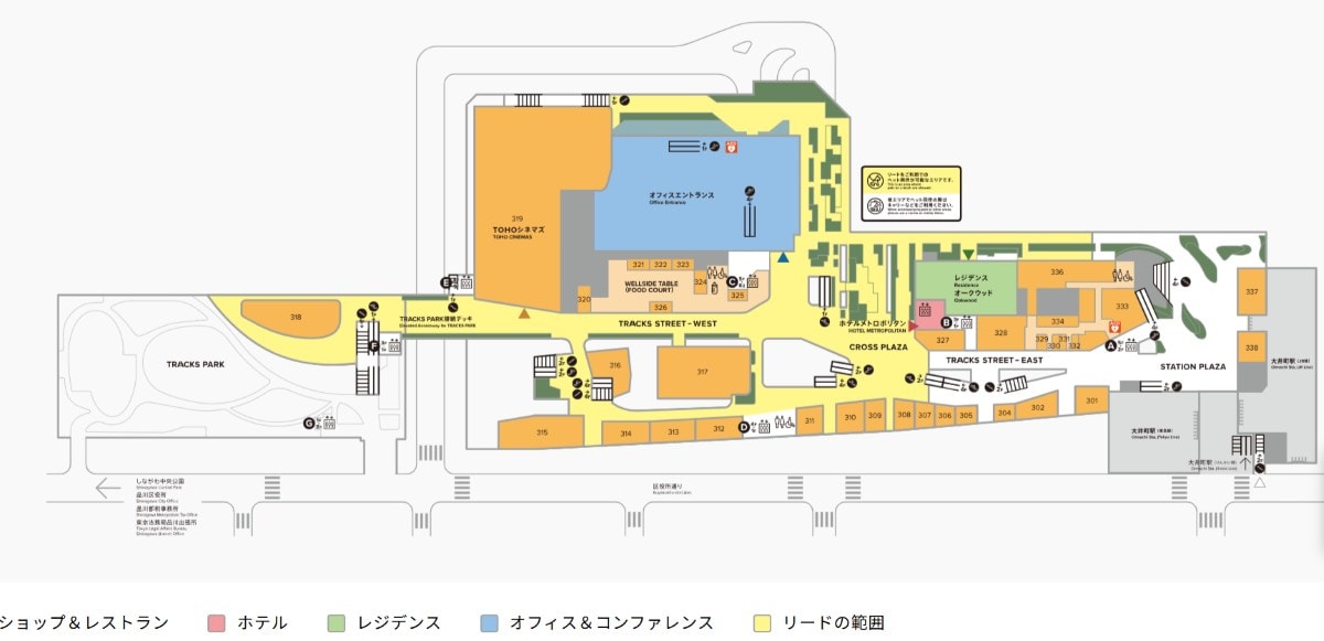 大井町トラックスは、2つの大きな建物と、TRACKS PARKと言われる広場で構成されます。