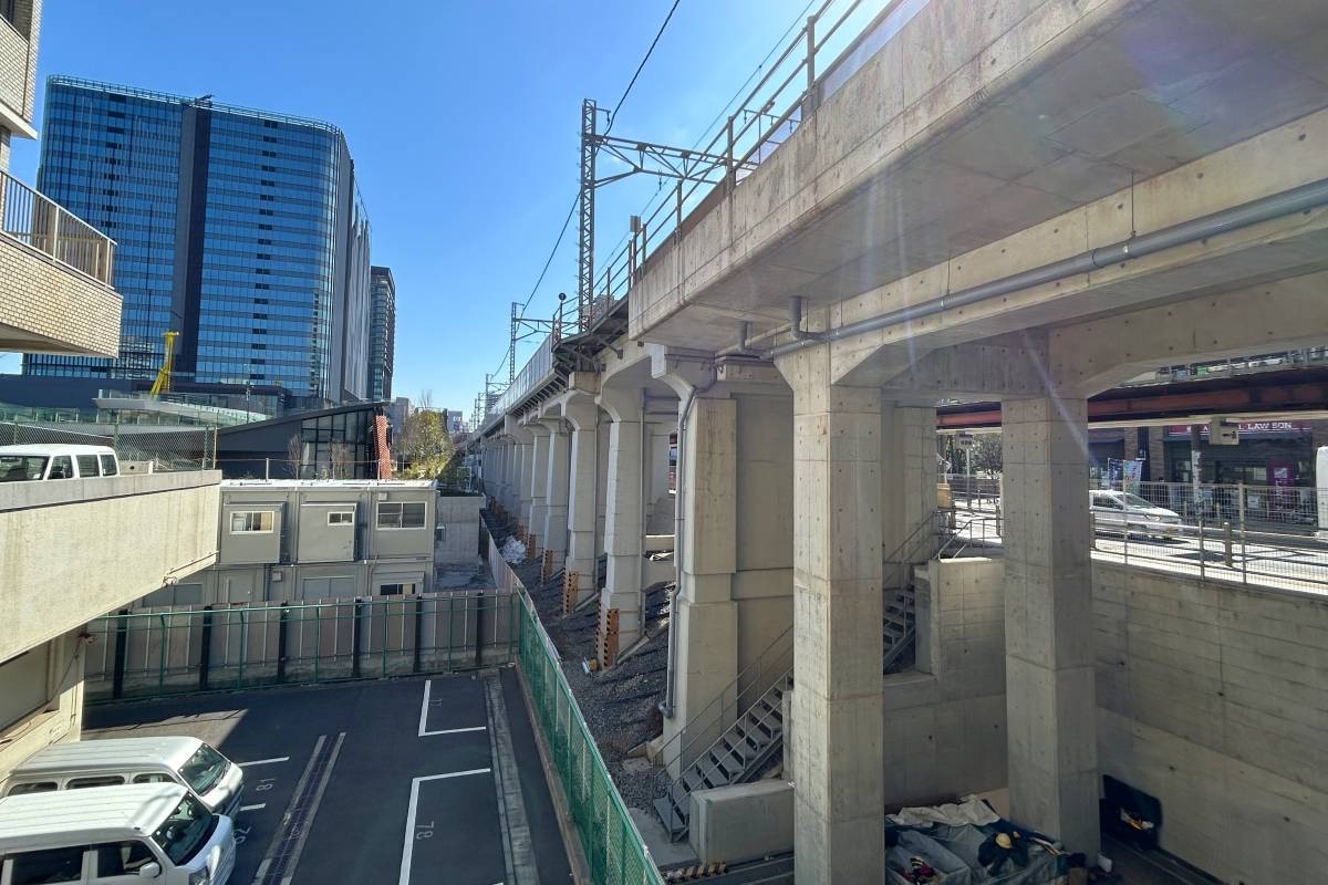品川区役所の下から、東急線の高架線沿いに東側を見ると、奥にトラックスパークに建つスターバックスカフェの建物が見えます。