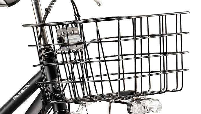 標準装備のワイヤーバスケットは、幅38.0cm×奥行28.0cm×高さ19.7cmの角型タイプ。通勤・通学バッグもしっかり収まるサイズ感です。ワイヤー素材のすっきりとした見た目がフレームのデザインとよく合い、実用性とスタイルを両立しています。