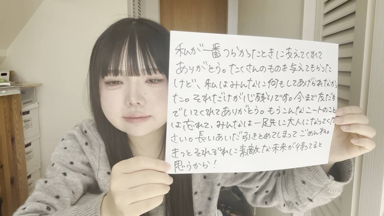私が一番つらかったときに支えてくれてありがとう。たくさんのものを与えてもらったけど、私はみんなに何もしてあげられなかった。それだけが心残りです。今まで友だちでいてくれてありがとう。もうこんなニートのことは忘れて、みんなは一足先に大人になってください。長いあいだ引き止めてしまってごめんね。きっとそれぞれに素敵な未来が待ってると思うから!