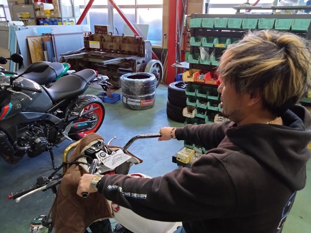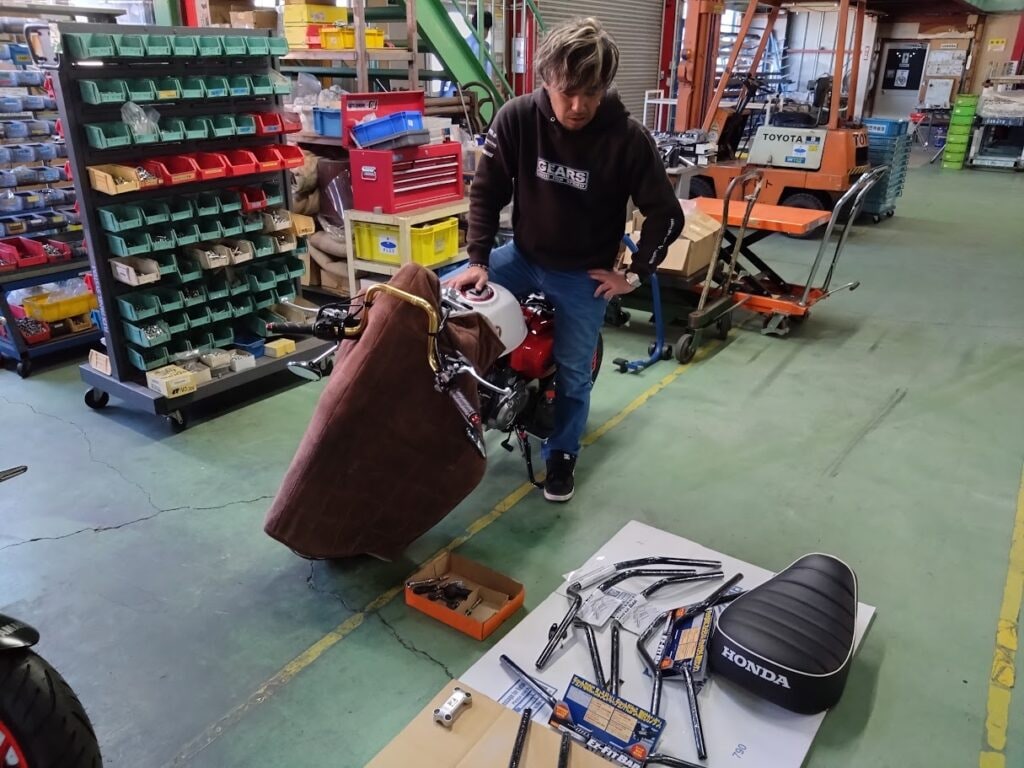 シートは低いものに変更するので、いったん取っ払ったままでハンドルとポジションを確認していきます。
