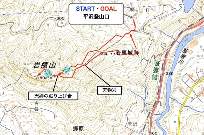 平沢登山口(55分)→天狗の蹴り上げ岩(18分)→岩櫃山(12分)→天狗の蹴り上げ岩(19分)→天狗岩(8分)→岩櫃城址(13分)→平沢登山口