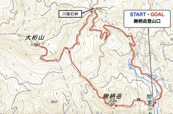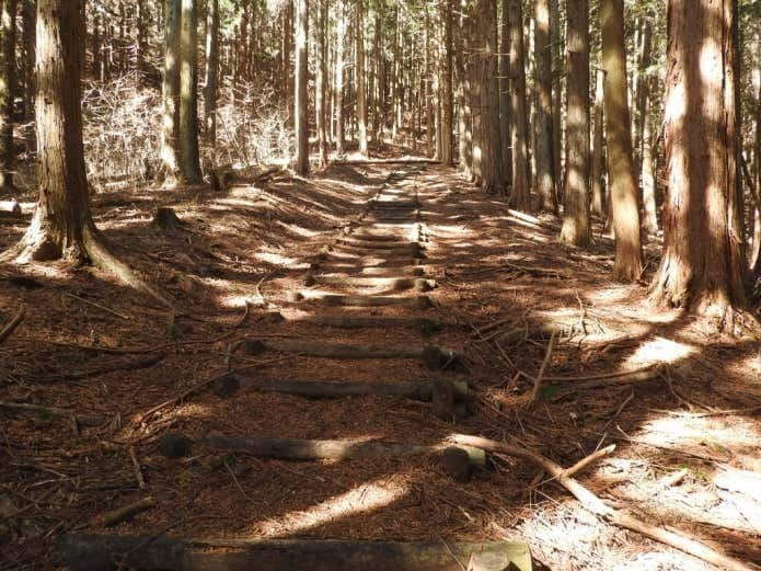 頂上取付点へ戻り山腹に設けられた林道を越えて斜面を登ると、変形十字路へ。大桁山までは、階段状の登山道が続きます。下山は川後石峠経由で、登山口まで下りましょう。電車の人は、関東ふれあいの道を通って、千平駅まで向かいます。